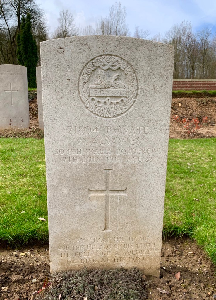 Choices of epitaphs varied from quotations of scripture or literature (Tennyson being the most popular), direct reference to the war or civilian life (underlining personal details such as age or hometown) or simply traditional pre-war epitaphic language. Most commonly next of kin used a combination of these. By looking at the over-arching themes conveyed in PIs we are able to learn a lot about the culture and attitudes of the bereaved, from religion’s influence to gender roles, and much more. Whilst there are many striking and unusual epitaphs, I’d like to look at that of Private W.A. Davies, buried at Flatiron Copse on the Somme.